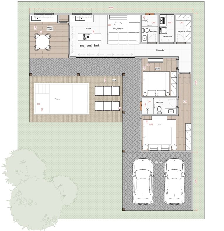 Projeto residencial de casa de campo em L com 2 quartos sendo 1 suíte e 144 metros quadrados.
