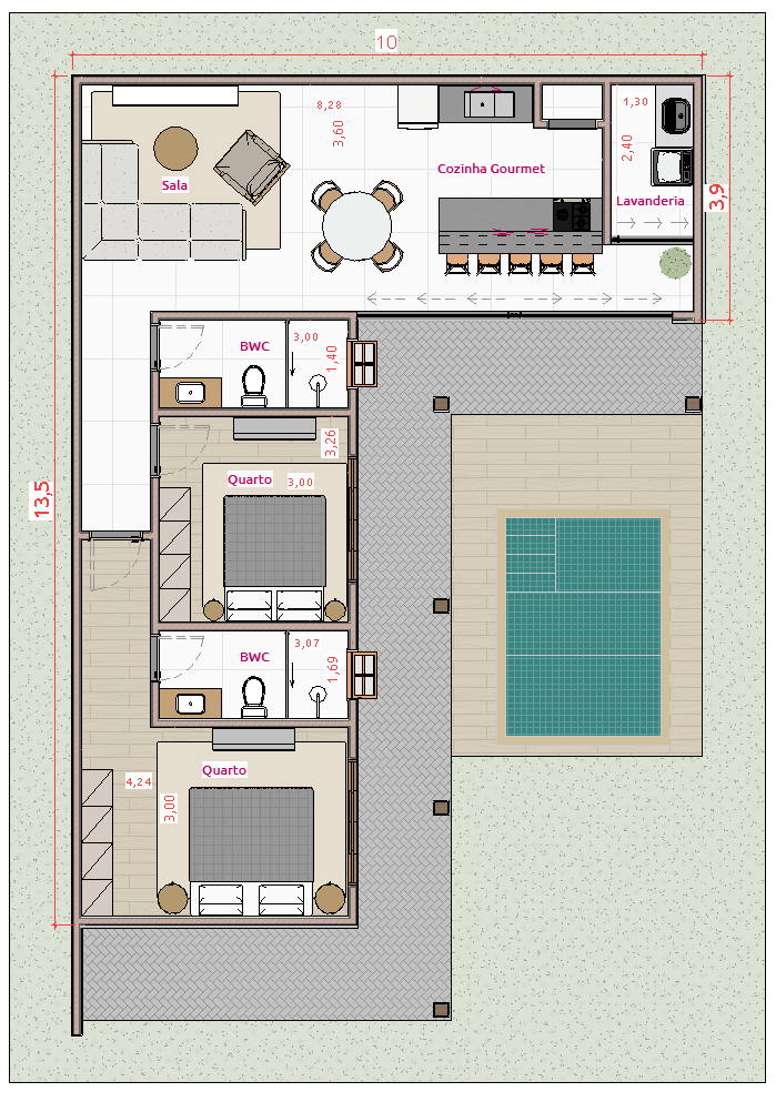 Projeto residencial de casa de campo em L com 2 quartos sendo 1 suíte e 82 metros quadrados.